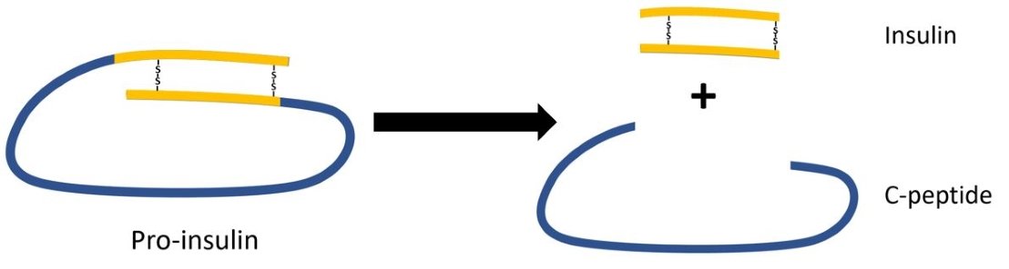 Depending on genetic and environmental factors, many people with type 1 diabetes retain some residual β-cell function (i.e. insulin production), sometimes persisting for many years. Furthermore, residual β-cell function has been shown to correlate with better regulation and fewer complications. Since people with type 1 diabetes administer exogenous insulin, residual β-cell function cannot be assessed by measuring insulin. During the production of insulin, proinsulin is cleaved into insulin and C-peptide, which are excreted into the blood in equal levels. Also, C-peptide has a longer half-life, providing a more stable test window. Therefore, measuring stimulated C-peptide production is commonly used as proxy for residual β-cell function. It is becoming increasingly clear that even very low levels of C-peptide (i.e. insuline production) are associated with better outcomes and C-peptide assays are increasingly used near their detection limits.