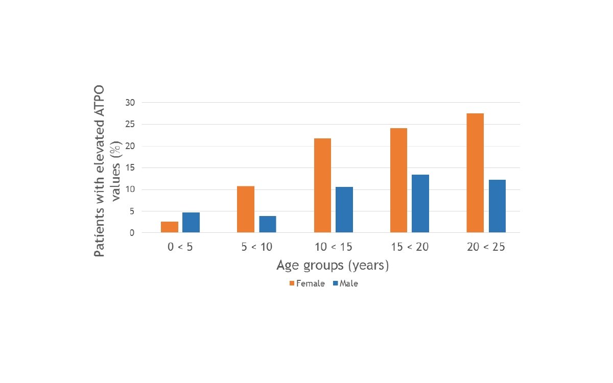 - Female patients were 2.4 times more likely than men to have an elevated ATPO level (18.7% versus 7.8% of patients, respectively). ATPO values were also significantly higher in female patients than in male patients (227 U/mL versus 190 U/mL, respectively; p<0.001).