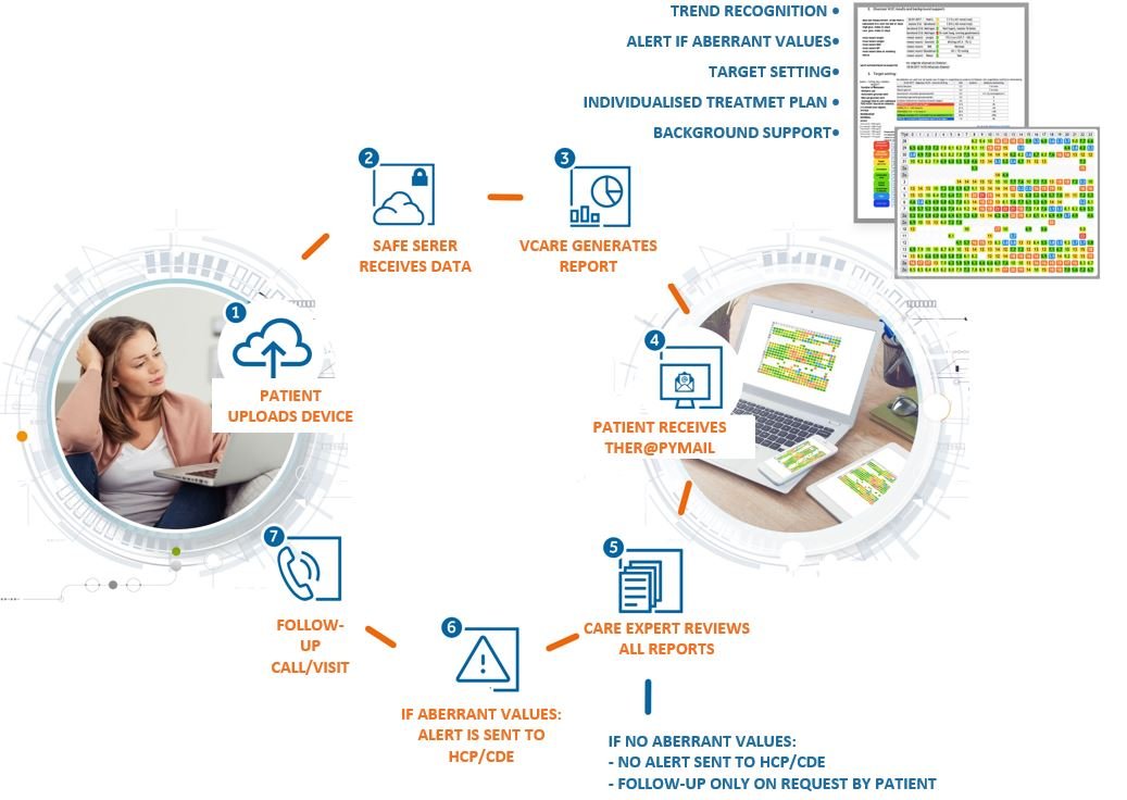Applying the Diabeter concept involved a shift from three-monthly ‘live’ appointments to a mixture of a) ‘live’ visits, b) ad-hoc contacts (email, phone) initiated by the people with diabetes/parents, and c) automated contacts and use of Ther@piemail: after uploading their device(s), people with diabetes receive personalized e-mails with advice based on VCare-algorithms which is checked by HCPs.